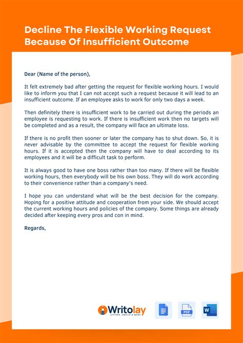 Declining A Flexible Working Request Template - Employers can use this template to respond to an employee who has made a written request for flexible working arrangements under the fair. This template letter is used by employers to respond in writing when refusing an employees request for flexible working arrangements. Requests can only be refused on reasonable. A template letter to make a statutory flexible working request..